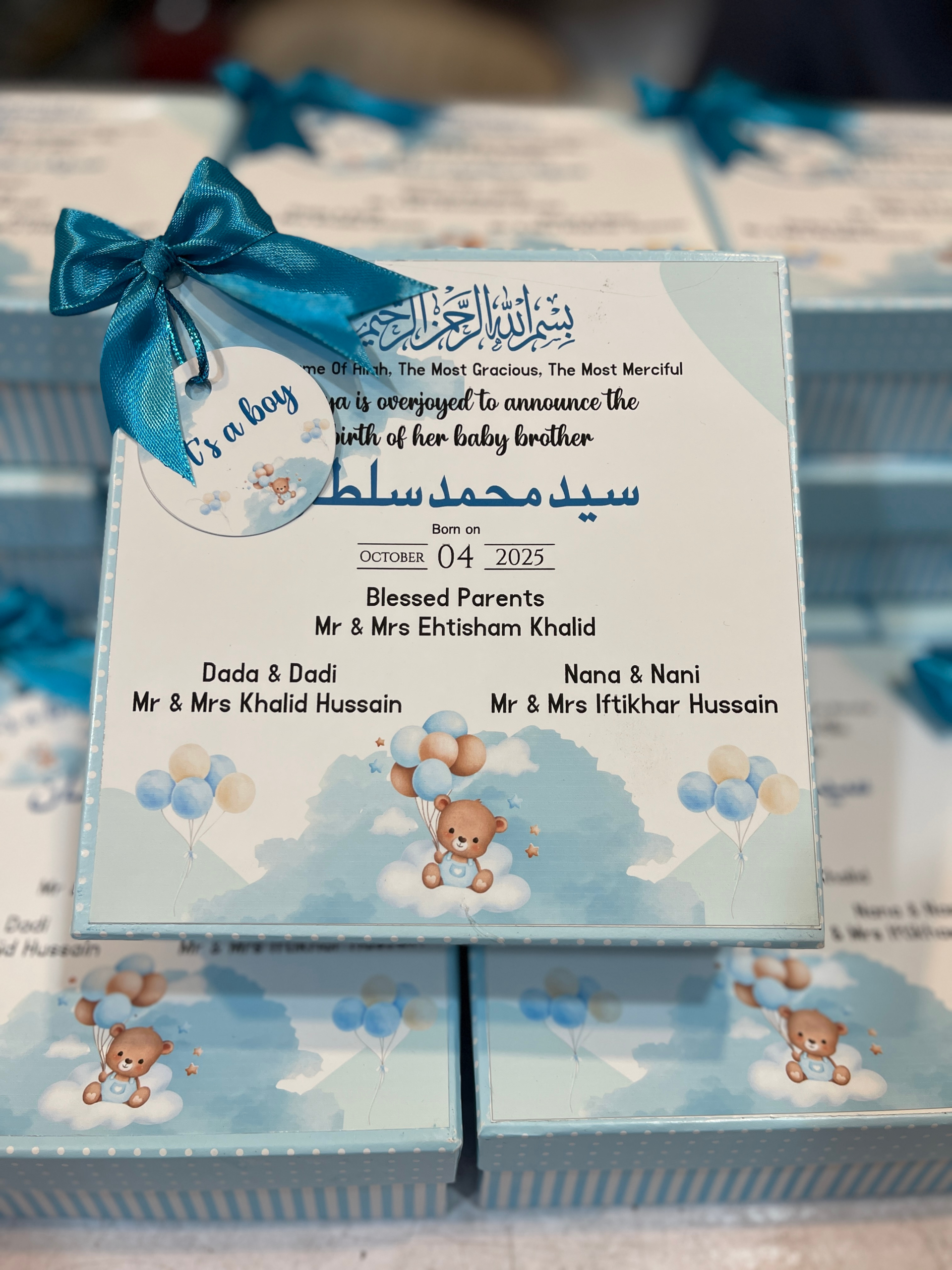 Every baby brings a world of happiness, hope, and love, and our Baby Announcement Sweet Boxes are thoughtfully designed to celebrate this magical moment. These newborn sweet boxes are perfect for families who cherish tradition, personalization, and meaningful celebration.