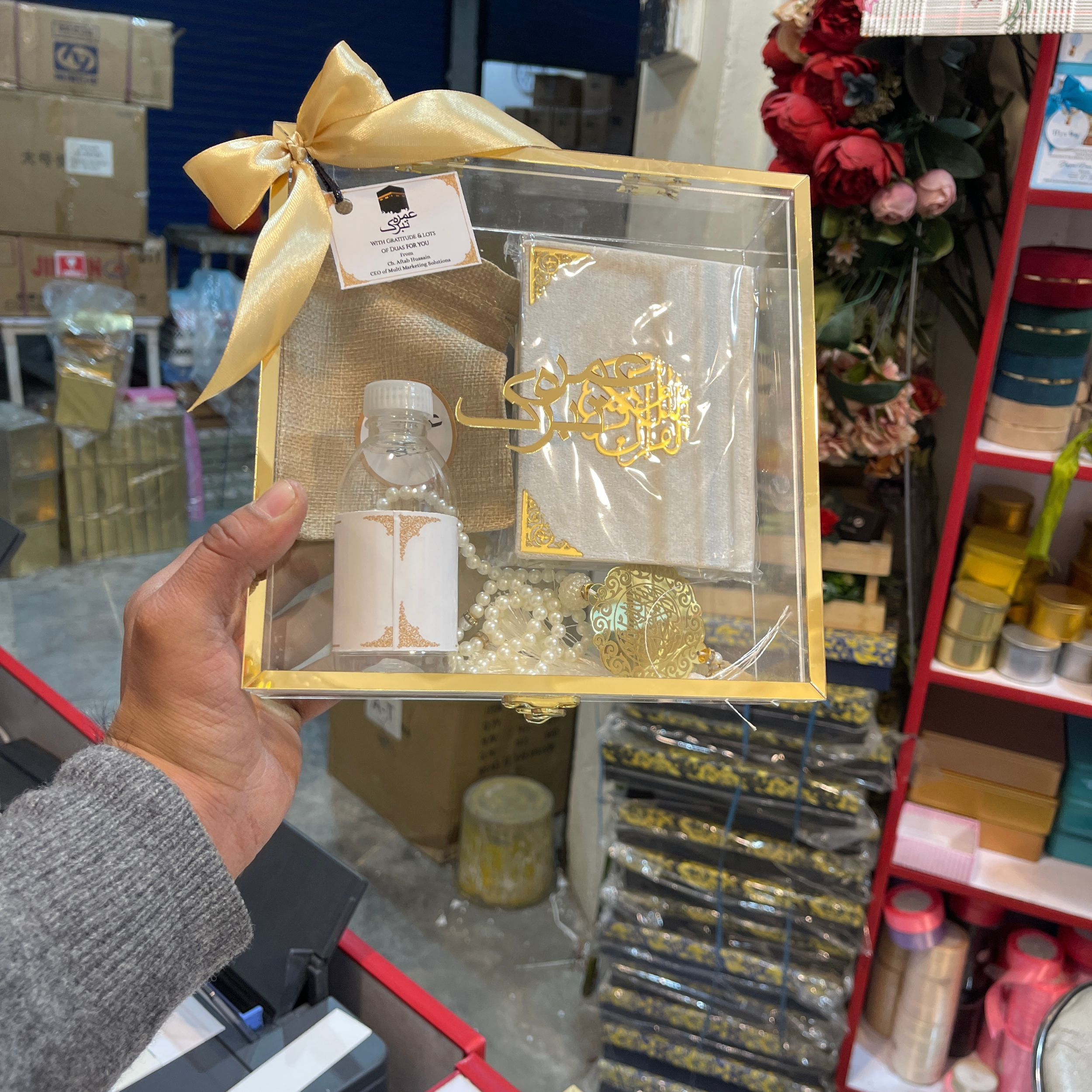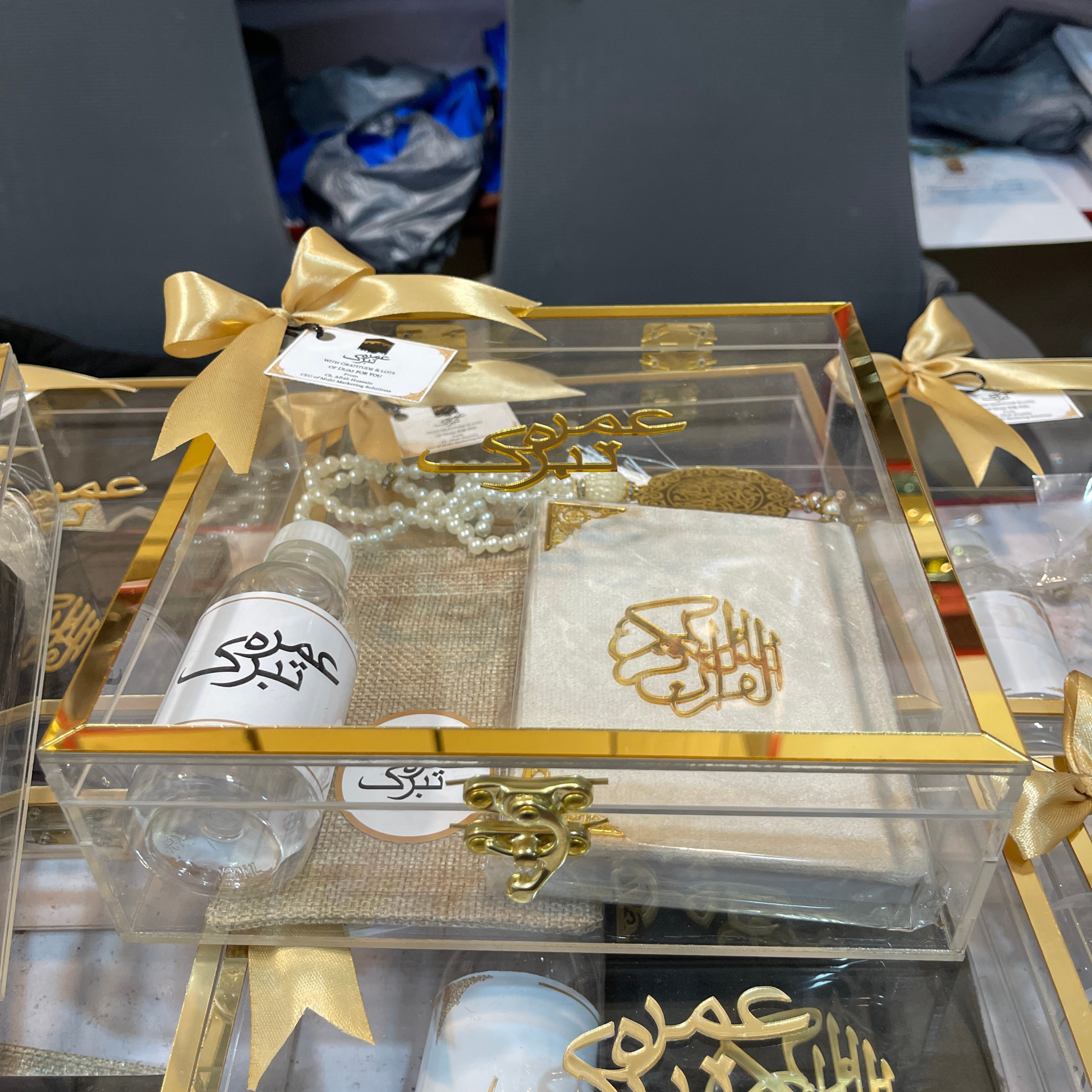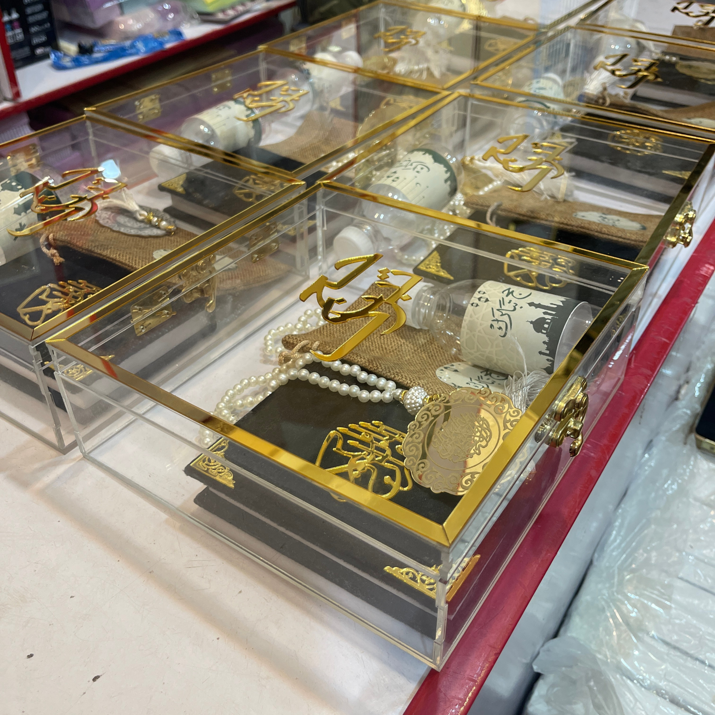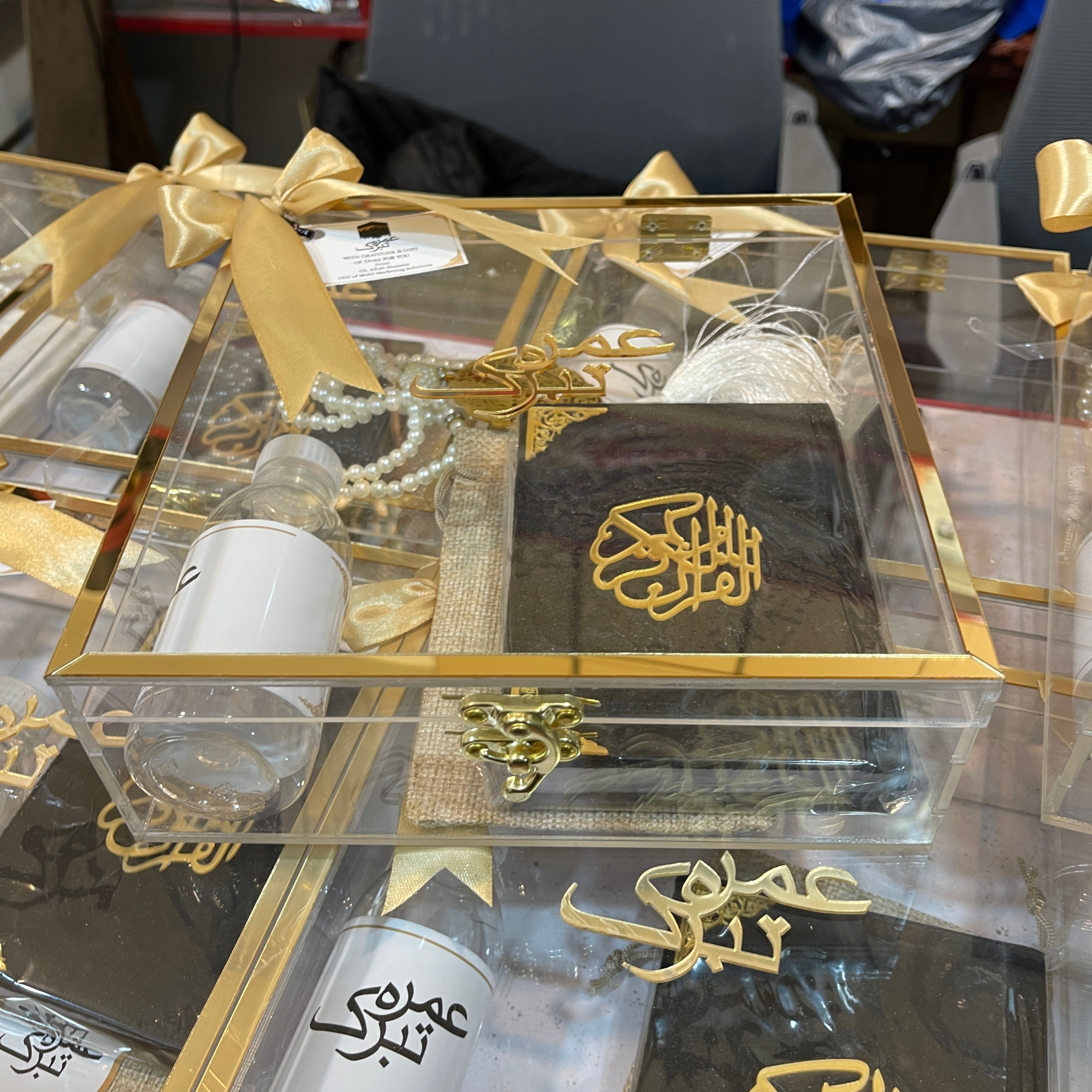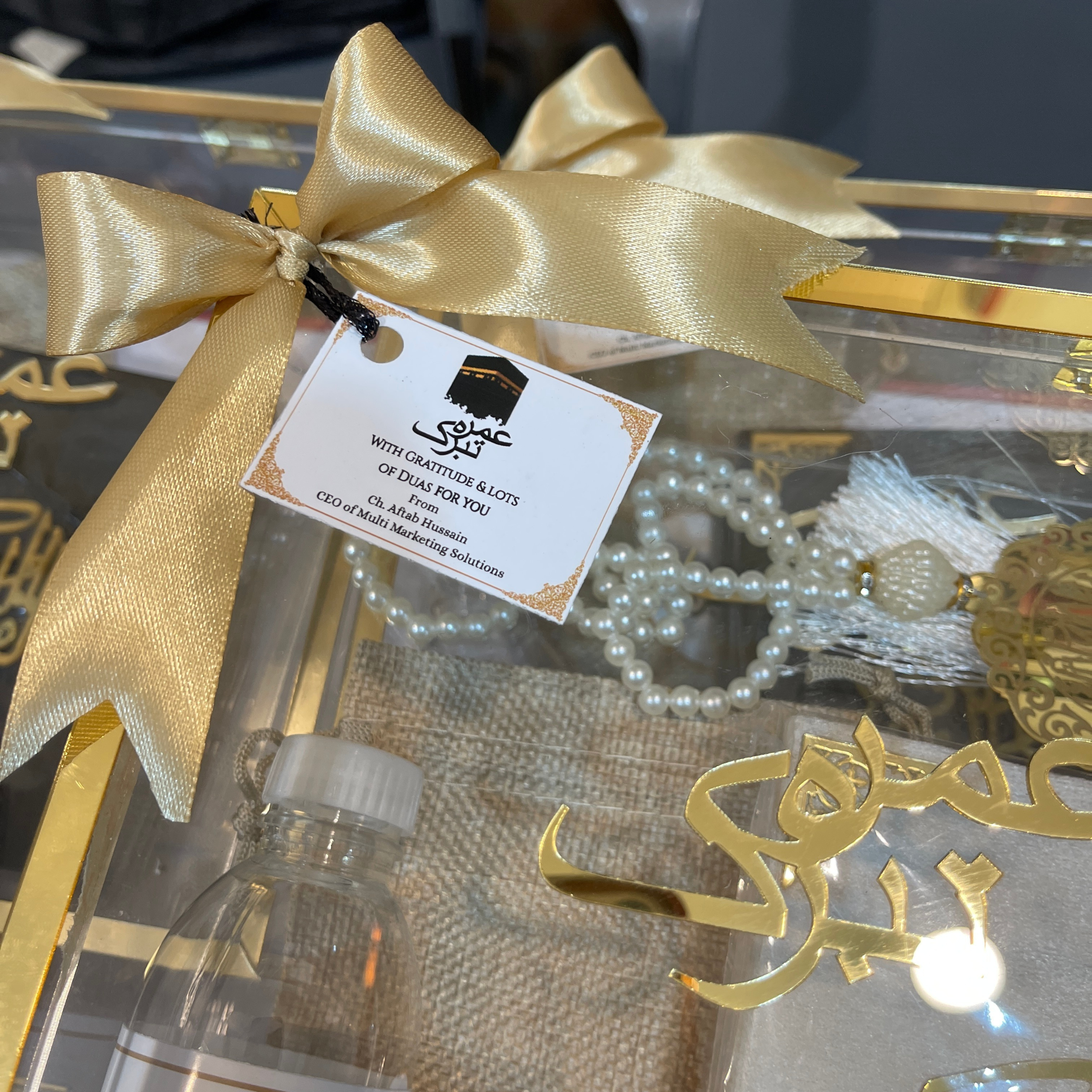 Some gifts touch the soul, not just the eyes. Our Luxury Umrah Gifts Acrylic Box honors the sacred Umrah and Hajj Tabarak journey with dignity, devotion, and elegance. Featuring a premium acrylic design with golden Umrah Tabarruk tag, velvet Quran Pak, and 100-beat Tasbih with Kalma engraving, this package transforms into a meaningful Umrah and Hajj gift. The customized name tag and ribbon bow add a personal touch, making it perfect for Umrah gifts, spiritual milestones, Ramadan, or special occasions, sharing blessings that are cherished long after.