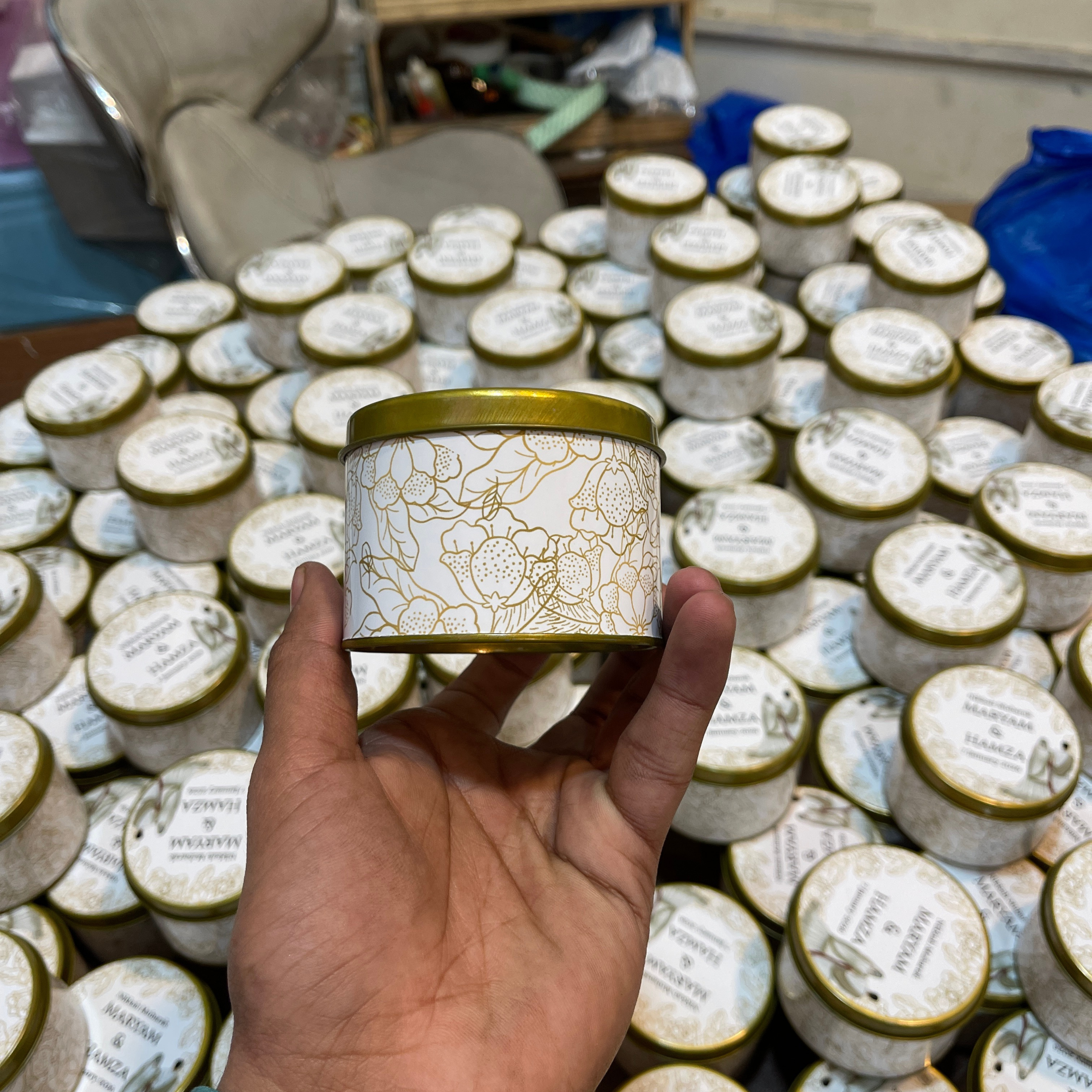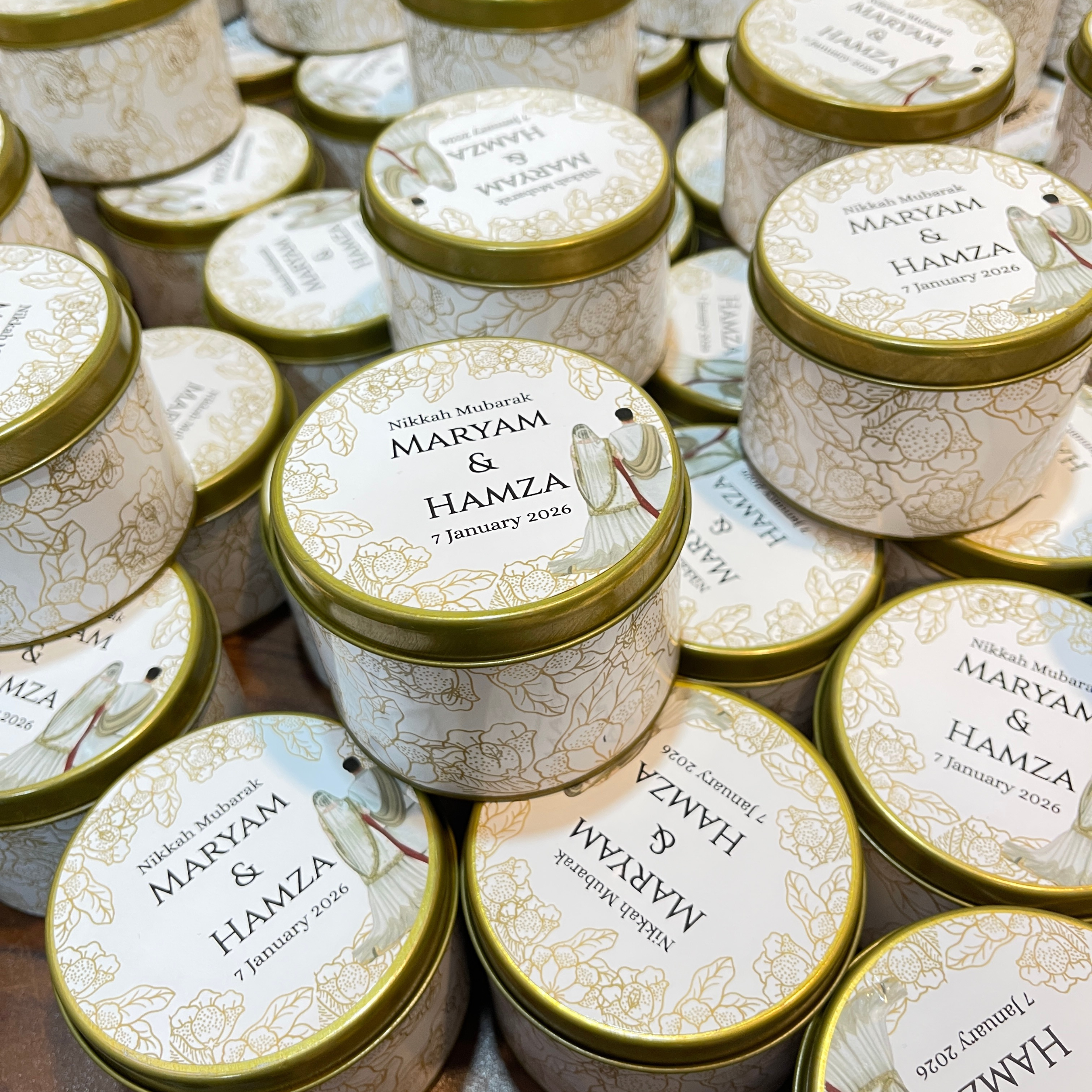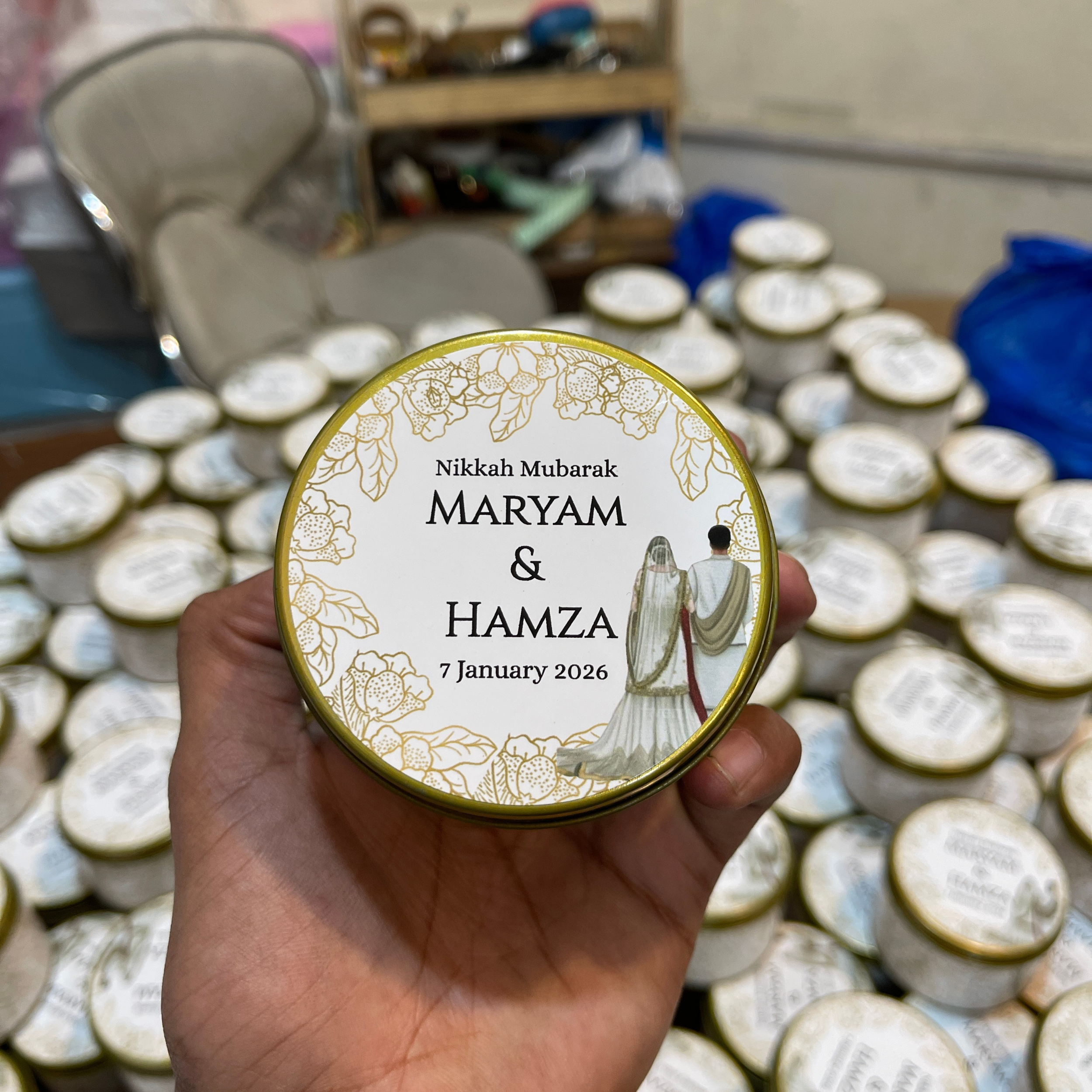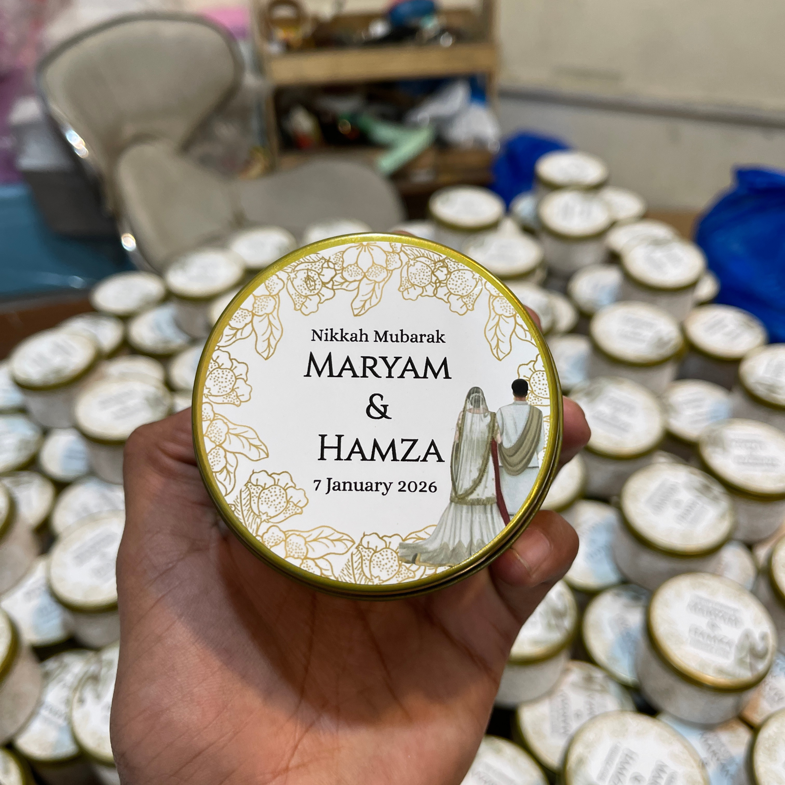 Our Nikkah Favor Tin Box is thoughtfully designed for families who value personalization, elegance, and lasting memories. The 3×3 inch size makes it perfect for table arrangements or gift corners, while the customized print adds a heartfelt and personal touch. Ideal for Nikkah favors, guest giveaways, or small gift collections, this tin box ensures your celebration is remembered with love and style.