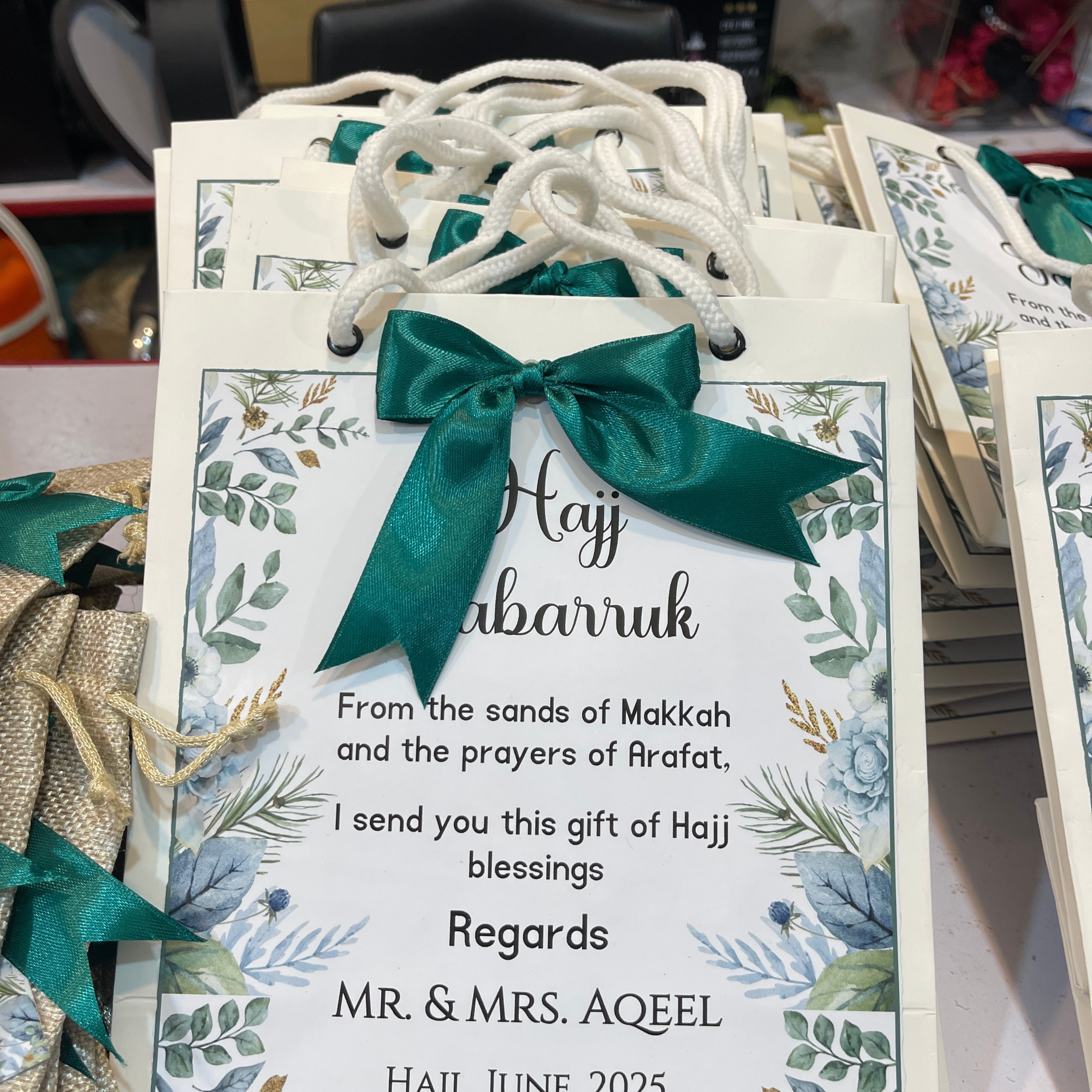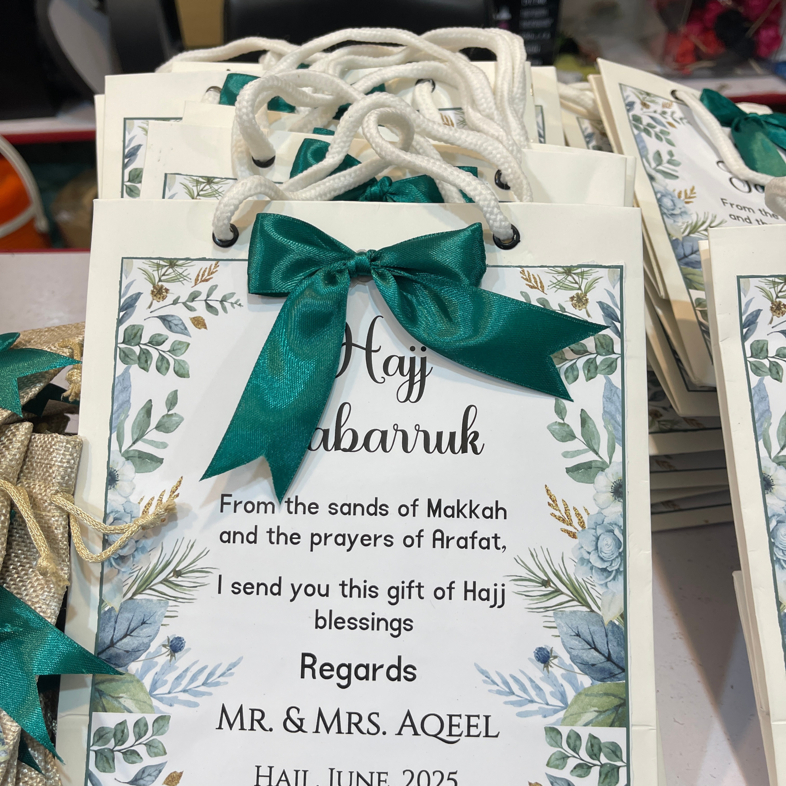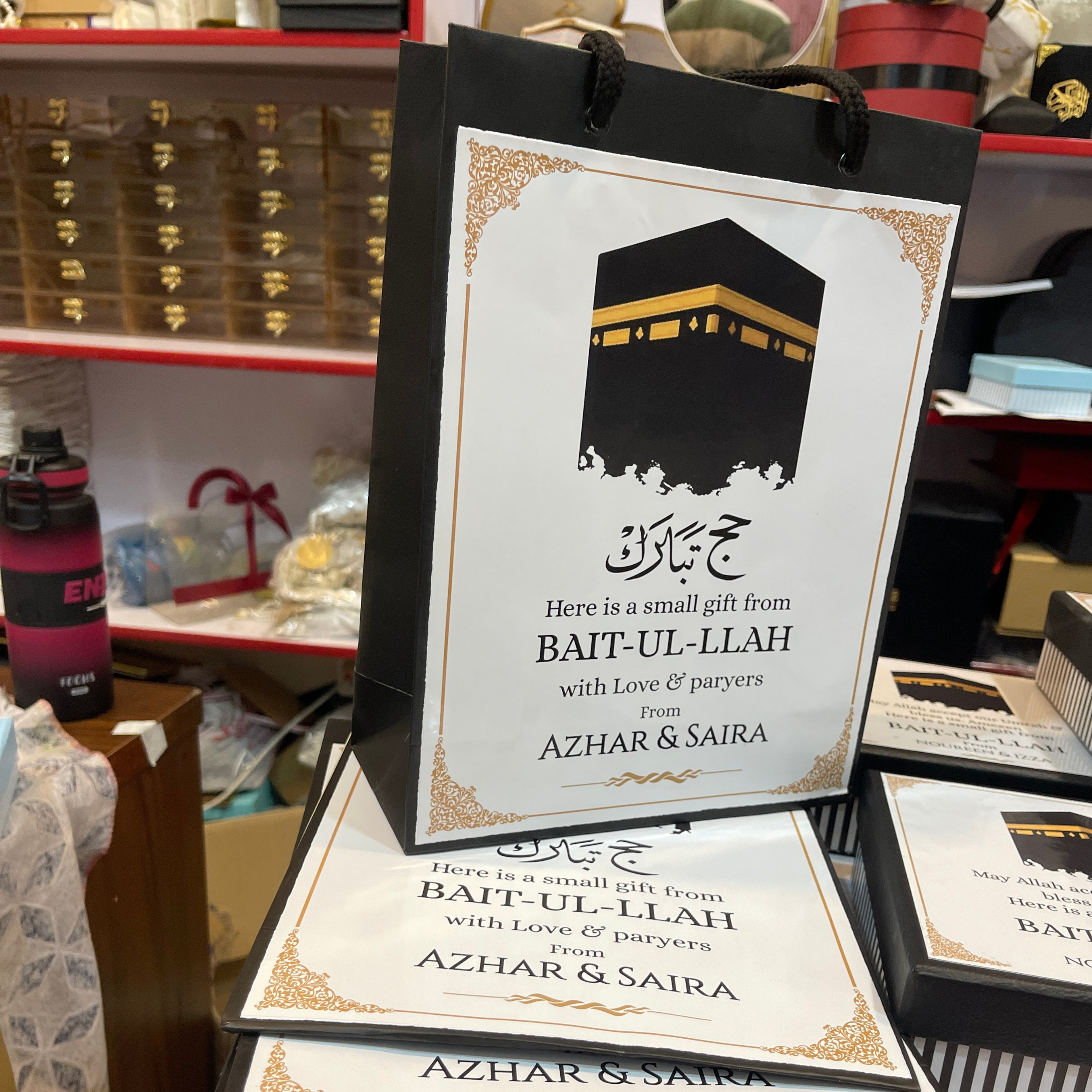 Celebrate sacred moments with our Umrah and Hajj Tabarak Bags Package, perfect for Umrah and Hajj return gifts packing in Pakistan. These premium bags allow you to share blessings, Umrah and Hajj favors, Aameen gifts, and thoughtful Hadiya with family and friends.